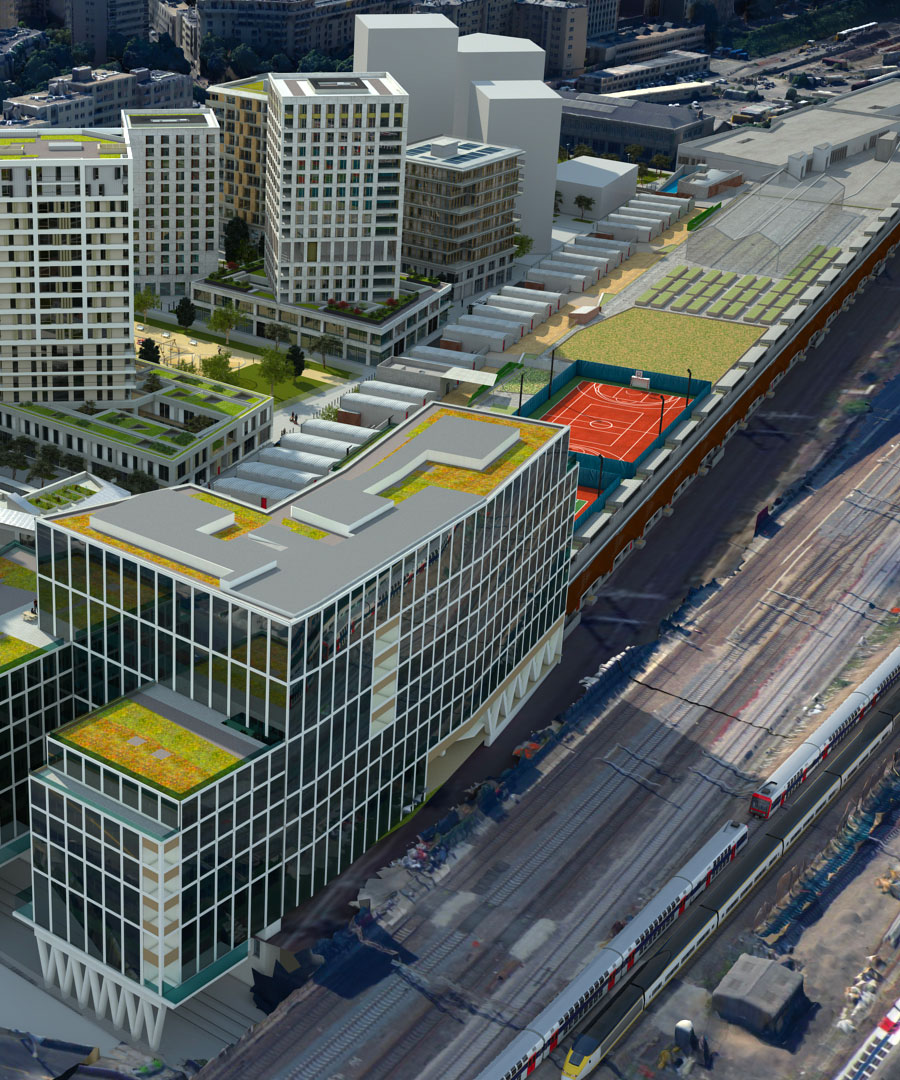 Projet d’envergure de requalification de fonciers ferroviaires, mené par l’aménageur Espaces Ferroviaires dans le Grand Paris, Chapelle International accueillera, dans un quartier innovant de 150 000 m2, 3000 nouveaux habitants et 3000 salariés, un nouveau hub logistique urbain, une des principales exploitation d’agriculture urbaine de Paris et des services innovants. Face à l’ambition du projet dans une zone longtemps délaissée, notre client a exprimé deux besoins principaux :